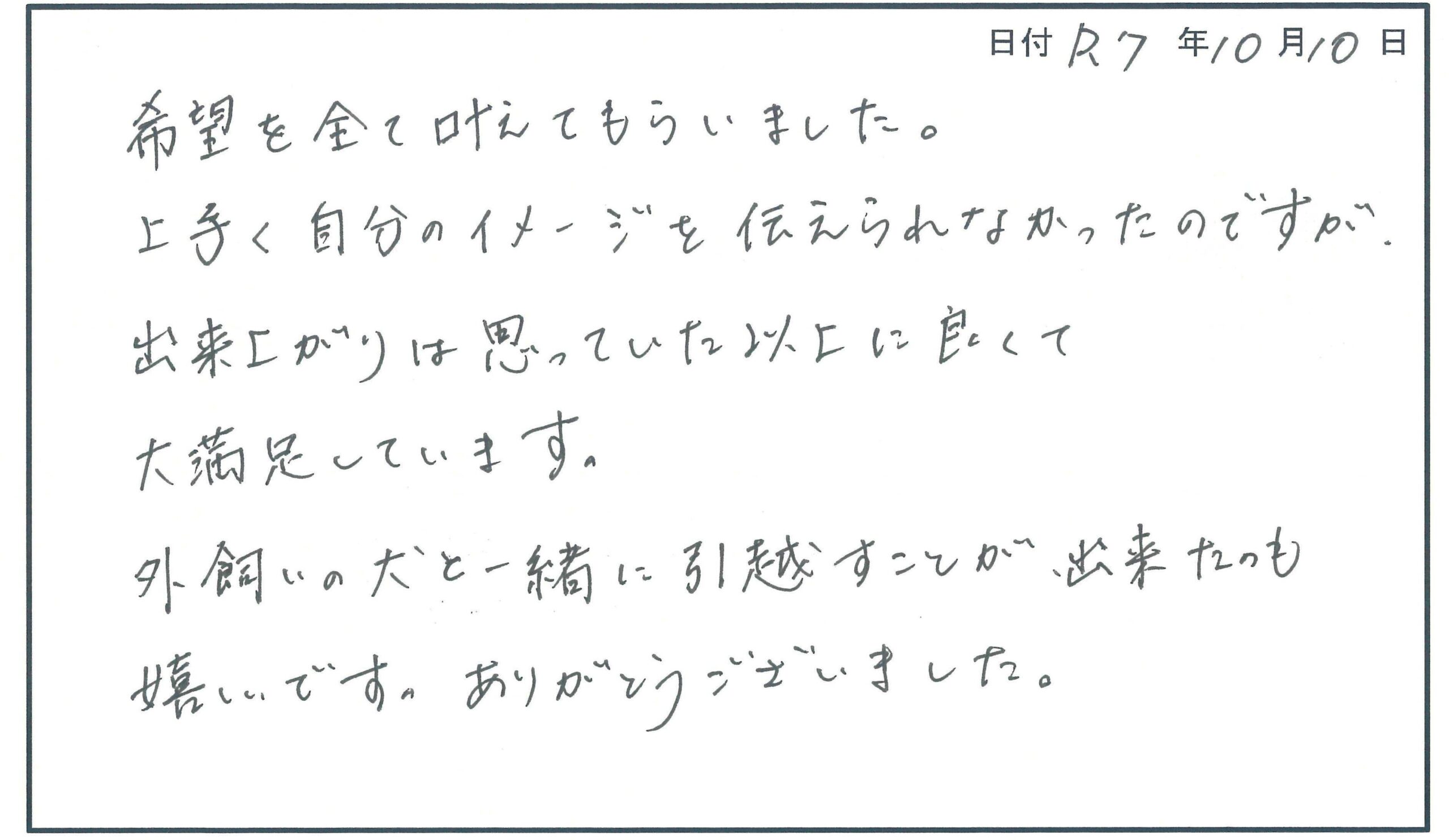 2026/04/17 希望を全て叶えてもらいました! 希望を全て叶えてもらいました。 上手く自分のイメージを伝えられなかったのですが、 出来上がりは思っていた以上に良くて 大満足しています。 外飼いの犬と一緒に引っ越すことが出来たのも 嬉しいです。ありがとうございました。 お客様の声一覧へ